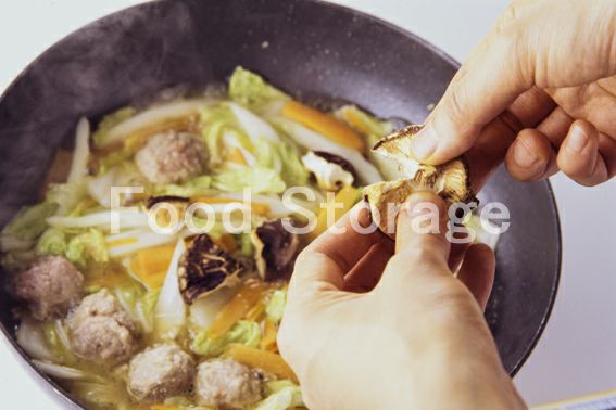 2が沸騰したら、1の肉だねのビニール袋の先を切って絞り出し、手で軽く形を整えて、加える。 |