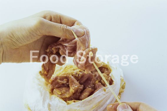 2の肉を1枚ずつ竹串に巻きつけながら刺す。 |