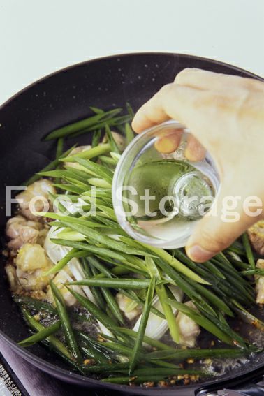 鶏肉を裏返し、1のねぎ、酒を加えて強火でアルコールを飛ばし、ふたをして弱火で1〜2分蒸す。 |