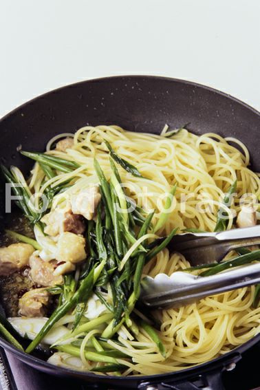 パスタ(スパゲッティ) 長ねぎ 万能ねぎ にんにく しょうが 鶏もも肉 赤唐辛子(輪切り) サラダ油 酒 塩 粗びき黒こしょう