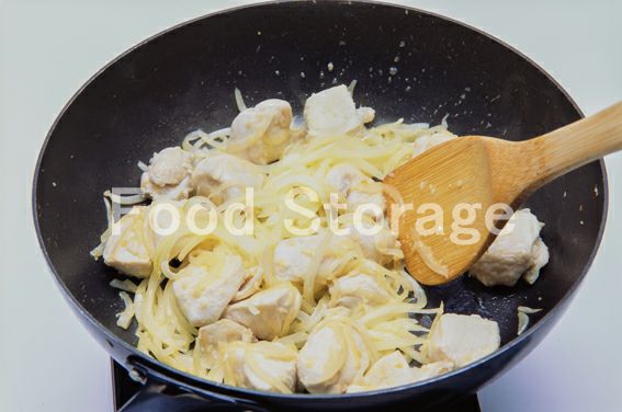 鶏むね肉はひとくち大に切り、玉ねぎは皮をむいて薄切りにする。 |