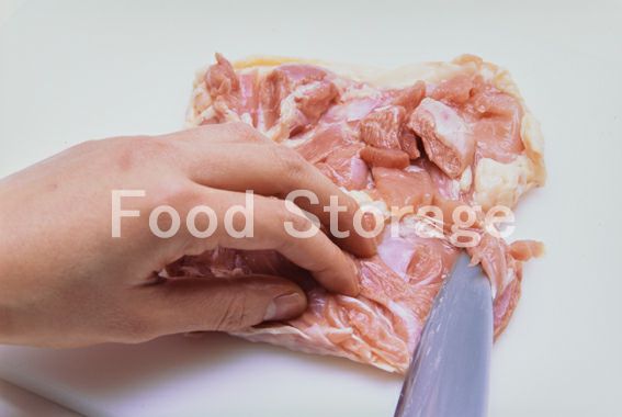 鶏もも肉は厚みのある部分に包丁で切りこみを入れて開き、叩いて5mm程度の厚みにする。 |