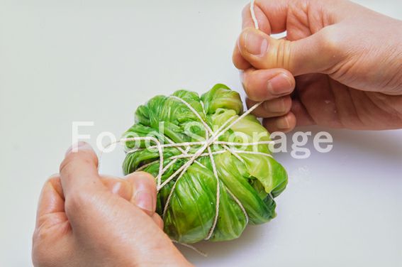 1のキャベツを広げて小麦粉をふり、4のタネをのせて丸く包む。もう一枚のキャベツで包みタコ糸でしばる。これを2個作る。 |