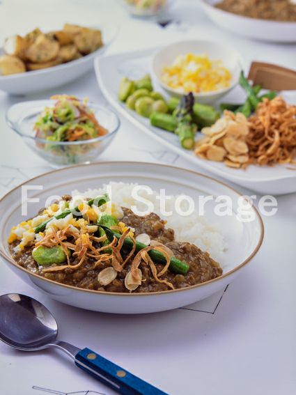 牛ひき肉 玉ねぎ にんにく しょうが カレールウ サラダ油 水 ごはん 塩 こしょう トッピング(アスパラガス そら豆 さやいんげん 新玉ねぎ スライスアーモンド ゆで卵 片栗粉 小麦粉 揚げ油