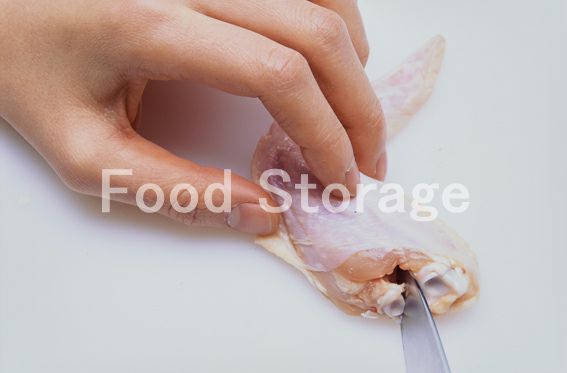 手羽先は、細い骨と太い骨が固くくっついている部分を包丁で切り離し、肉をひっくり返しながら骨を抜き取り、元の状態に戻す。 |