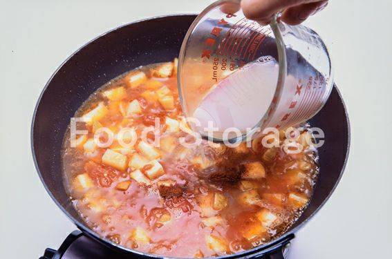 鍋にオリーブ油とにんにくを入れて火にかけ、香りがでたらじゃがいもを加えて炒める。ここにつぶしたトマトの水煮、Aと1のはまぐりの蒸し汁を加え、5分ほど煮る。 |