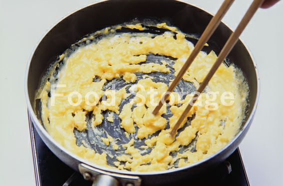 Aをボウルで混ぜ合わせ、鍋に流し入れて火にかけ菜箸でかき混ぜながら炒り卵を作る。 |