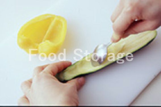 パプリカは縦半分に切ってヘタと種をとる。ズッキーニも縦半分に切る。それぞれにラップをし、一緒に電子レンジ(600W)で1分加熱する。ズッキーニはスプーンなどで中をくり抜いて刻んでおく。 |