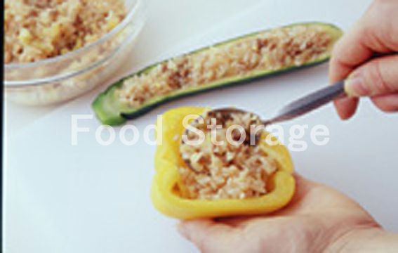 1のパプリカ、ズッキーニの器に軽く塩をふり、2をすき間なく詰める。 |