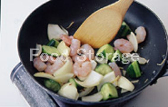フライパンにごま油を熱し、弱火でしょうが、赤唐辛子を炒める。香りがでたら水けを拭いたきゅうり、玉ねぎ、むきえびの順によく炒める。 |
