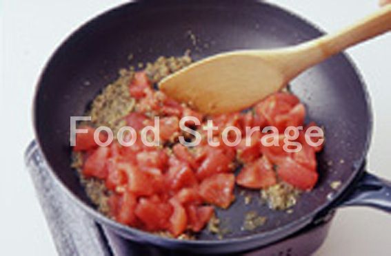 フライパンにオリーブ油、みじん切りのにんにくを入れて弱火にかけ、香りがでたら2のソース、1のトマトを加えてさっと全体を混ぜる。 |