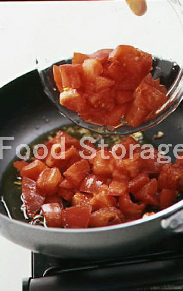 フライパンにトマト以外の2と、オリーブ油を入れて弱火にかけ、香りがでてきたら、トマトを加えて炒め合わせる。 |