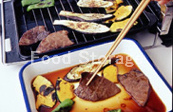 グリルで水けをきったなす、ピーマン、かぼちゃ、牛肩ロース肉をこんがりと両面焼き、焼けたものから合わせたAに漬けていく。 |