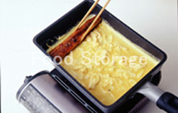卵焼き器に薄くサラダ油をしき、1/4量の2を流し入れ、全体に広げる。卵が半熟状になったら向こう側にうなぎをおき、うなぎを芯にして手前に向かって巻いていく。巻いた卵を向こう側に寄せ、サラダ油を敷いて残りの1/3量の2を流し入れ全体に広げる。半熟状になったら、同じ様に手前に向かって巻く。これを繰返す。 |
