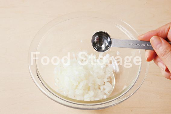 玉ねぎの半量はみじん切りにし、耐熱ボウルに入れて塩、サラダ油少々を加え、ふんわりラップをして電子レンジ(600W)で1分ほど加熱する。残りはくし形切りにする。 |