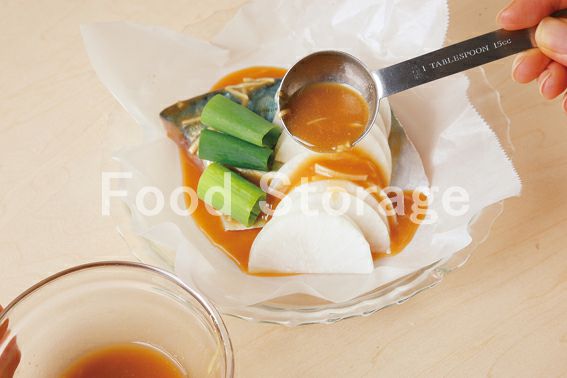 耐熱容器にクッキングシートを敷いてさばを入れ、よく混ぜた2の1/2量をまんべんなくかけ、その上に長ねぎ、大根をのせ、さらに残りの2をかける。