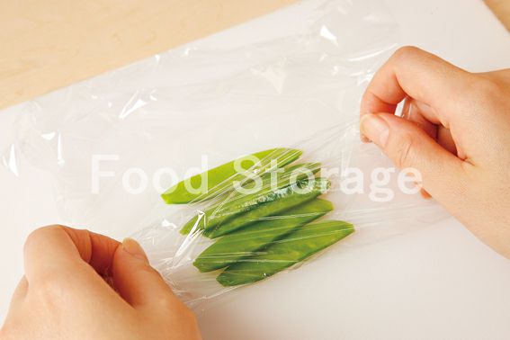さやえんどうはヘタと筋を取り、ラップに包んで電子レンジで30秒ほど加熱し、斜め半分に切る。 |