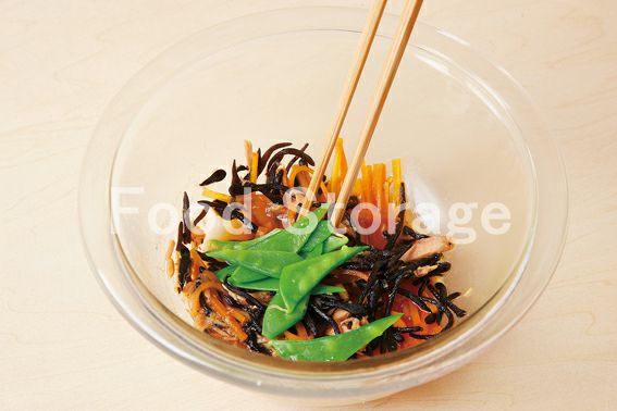 ひじき(乾燥) にんじん さやえんどう ツナ(缶詰・小) A(だし汁 しょうゆ 砂糖 ごま油)
