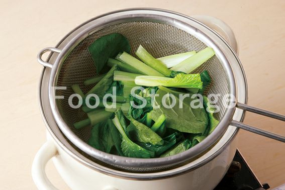 ざく切りにした小松菜を1の湯に加え、さっとゆでて取り出す。 |