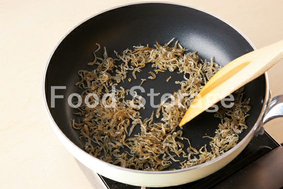 フライパンにごま油、サラダ油を熱し、ちりめんじゃこをカリカリになるまで炒める。