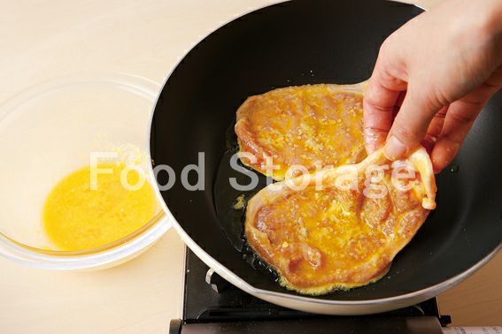 フライパンにオリーブ油を中火で熱し、Aに豚肉を1枚ずつくぐらせ、両面に軽く焦げ色がつく程度に焼く。(残った卵液は取っておく。※ブロッコリーのココットに使用) |
