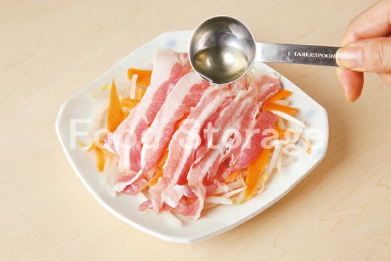 耐熱容器にに、もやし、にんじん、豚肉の順にのせ、酒、塩、粗びき黒こしょうをふってラップをする。