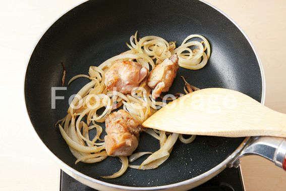 サラダ油を熱したフライパンで鶏肉を炒め、きつね色になったら玉ねぎを加えてさらに炒める。 |
