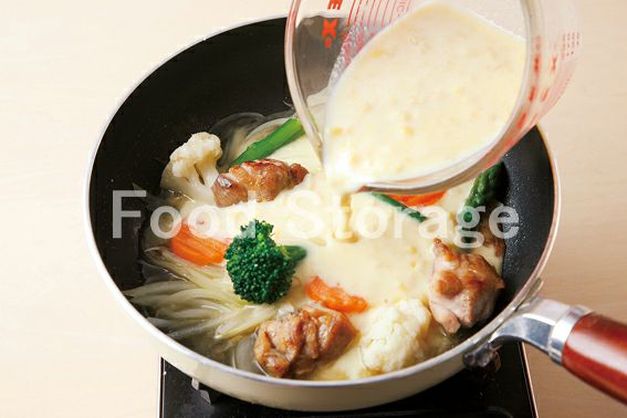 温野菜ミックスとBを加え、温まったら塩、こしょうで味を調える。 |