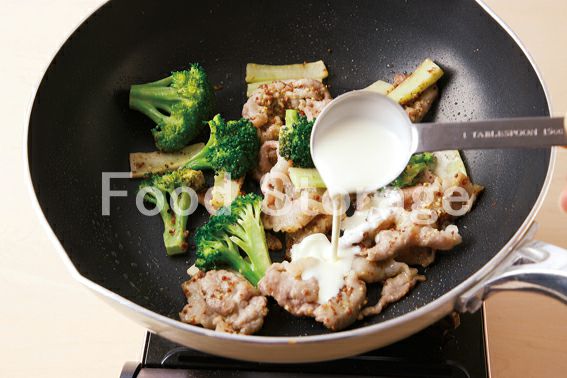 | 豚肉をブロッコリーでボリュームアップ、粒マスタードで酸味と辛みを効かせました。 |