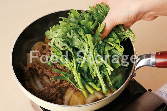 【牛肉のすき煮風】牛切り落とし肉 玉ねぎ 春菊 サラダ油 A(水 みりん 砂糖 しょうゆ 卵