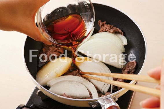 小さいフライパンにサラダ油を熱し、牛肉を炒め色が変わったら、玉ねぎ、Aを入れて中火で3分煮る。 |
