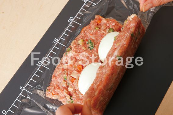 3.ラップを敷き2の生地を広げて、その上に殻をむいたゆで卵をのせ、のり巻きのように巻き、両端をねじって、端を下に入れながら耐熱容器に乗せる。 |