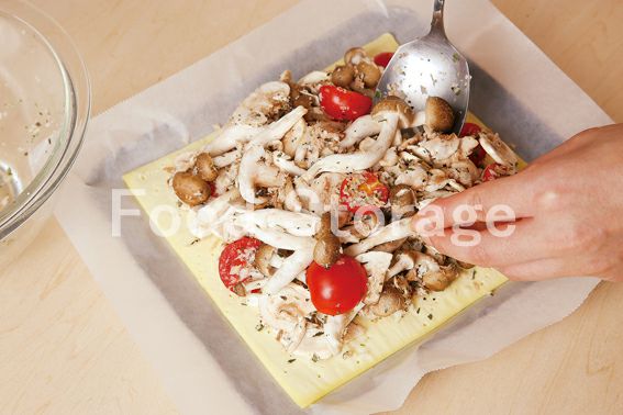 冷凍パイシート(20×20cm) A(しめじ マッシュルーム ツナ(缶詰) プチトマト にんにく B(ドライバジル パン粉 塩 こしょう ピザ用チーズ
