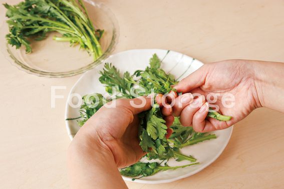 たけのこは5mmのくし型に切り、豚トロ肉とともに塩をふる。春菊は固い根元は切り落とし、手で半分ちぎり、器に敷く。 |