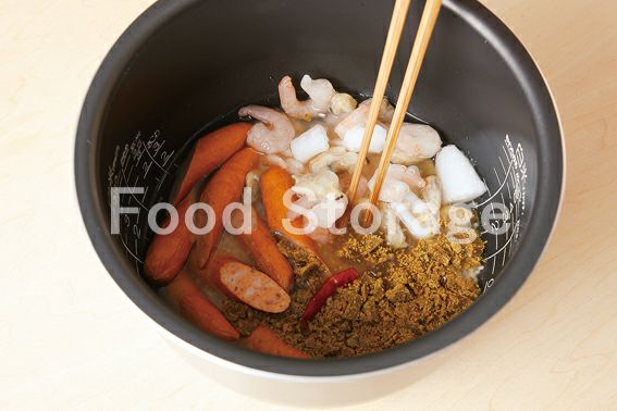 | 炊飯器で作るスパイシーなピラフは、市販のカレールーで。 |