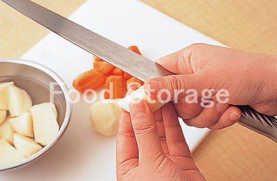 じゃがいも、にんじんは皮をむき、食べやすい大きさに切りし、角を切り落として面取りをする。じゃがいもは水にさらしておく。 |