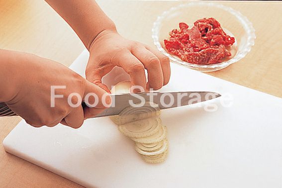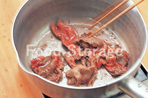 玉ねぎは皮をむいて繊維に直角になるよう薄切りにし、牛肉は5㎝幅に切る。 |