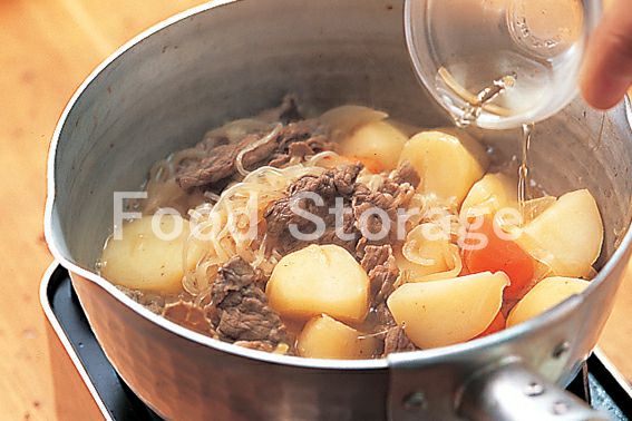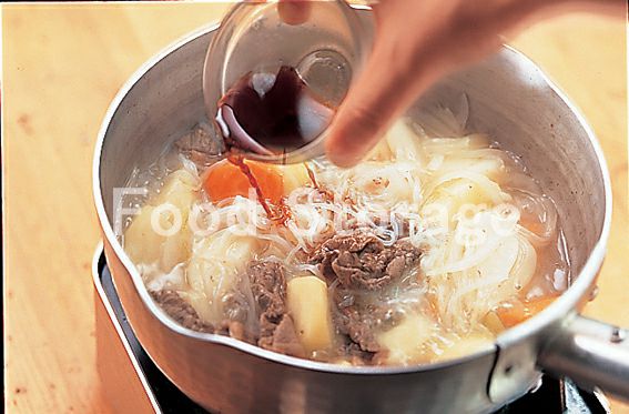 鍋にサラダ油を熱して牛肉を炒める。色が変わったら、玉ねぎを加えてさっと炒める。じゃがいも、にんじん、しらたきを加えて炒め合わせる。 |