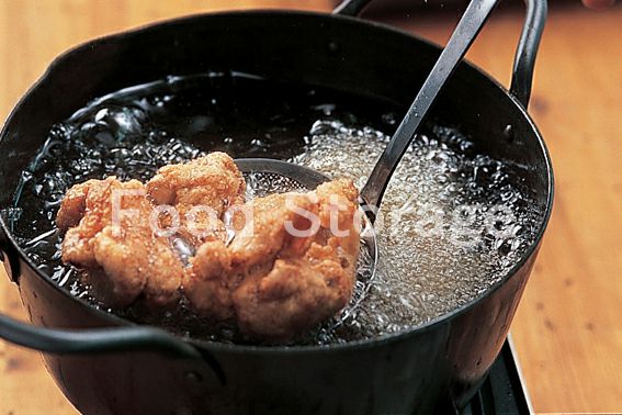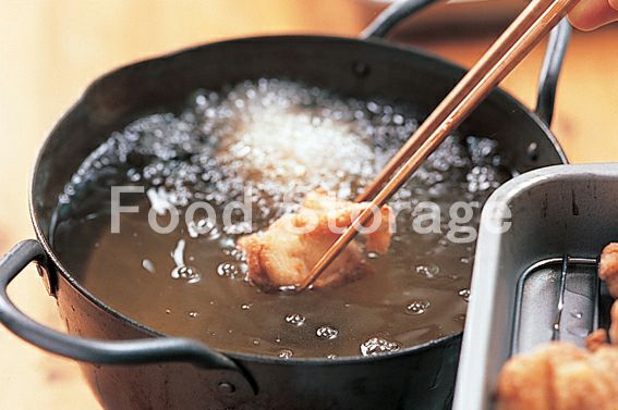 揚げ油の温度を180℃に上げ、取り出した鶏肉を戻し入れ、表面がカラッとするまで揚げる。皿に6と一緒に盛り合わせ、くし切りにしたレモンを添える。 |
