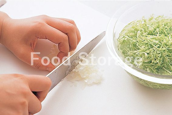 玉ねぎはみじん切りにし、つけ合わせのキャベツはせん切りにする。 |