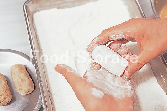 手にサラダ油(分量外)を塗り、5を6等分ずつ取って俵形に整え、小麦粉をまんべんなくまぶす。軽く押さえて形を整え、余分な粉を落とす。 |