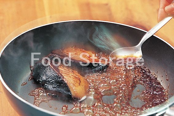 中火にしてフライパンをゆすりながら、たれをぶりに絡める。スプーンを使ってかけてもよい。ぶりを器に盛り、5の長ねぎを添える。 |