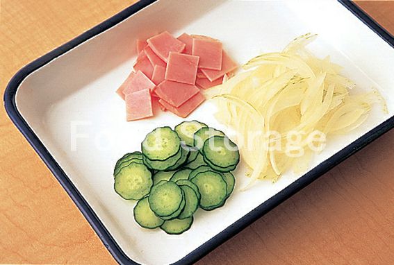 玉ねぎは薄切りにして水にさらし、水けをよく絞る。きゅうりは小口切り、ハムは2cm角に切る。 |