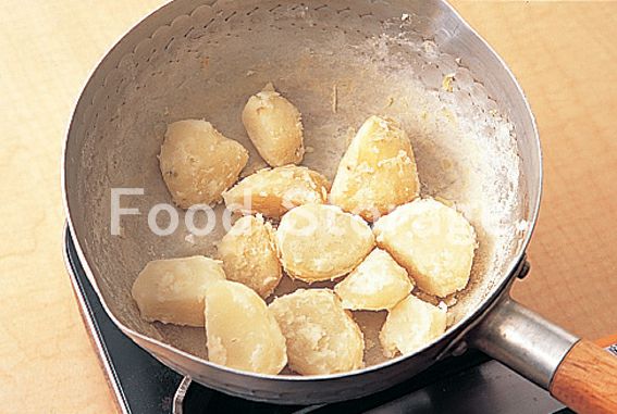 じゃがいもは皮つきのまま6つに切って水からゆで、ゆで汁をきる。熱いうちに皮をむいて鍋にもどし入れ、再び火にかけ、鍋をゆすりながら水けをとばす。 |
