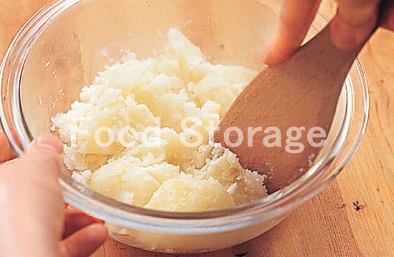 2をボウルに入れて熱いうちに木べらでつぶし、Aを加えて混ぜる。 |