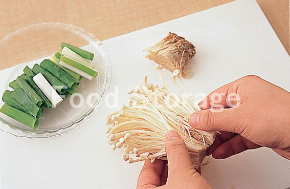 えのきだけは根元を切って食べやすくほぐす。わけぎは4㎝長さに切る。 |