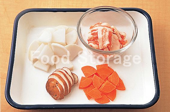 豚ばら薄切り肉は3?幅に切り、大根、にんじんは皮をむいていちょう切りにする。しいたけは軸を取って薄切りにする。 |