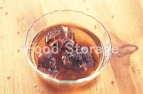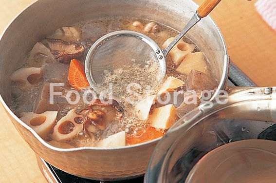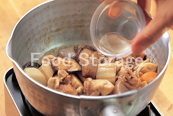 2のしいたけと戻し汁、3、だし汁を加えて強火で煮る。煮立ったらアクを取り、中火にして砂糖、酒を加え、落としぶたをして煮る。 |