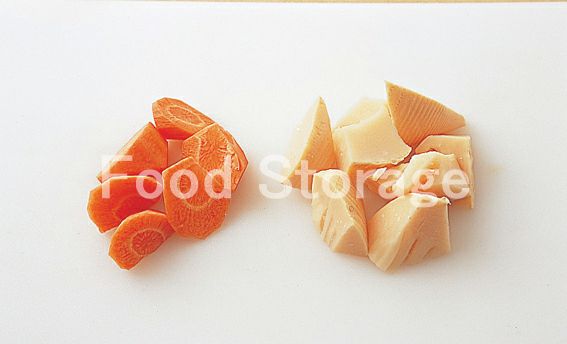 にんじん、ゆでたけのこは食べやすい大きさに乱切りにする。 |