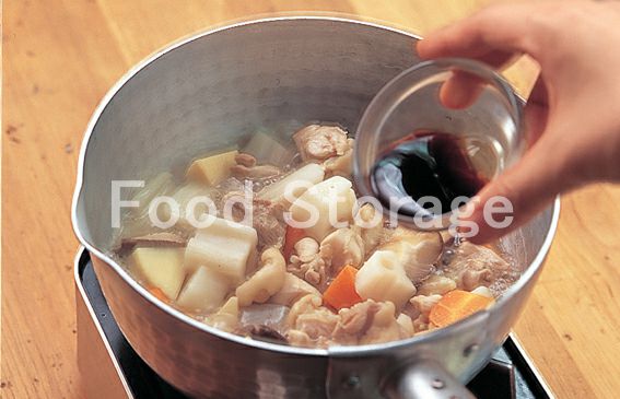 野菜に竹串が通るほどやわらかくなったら、しょうゆを加える。 |